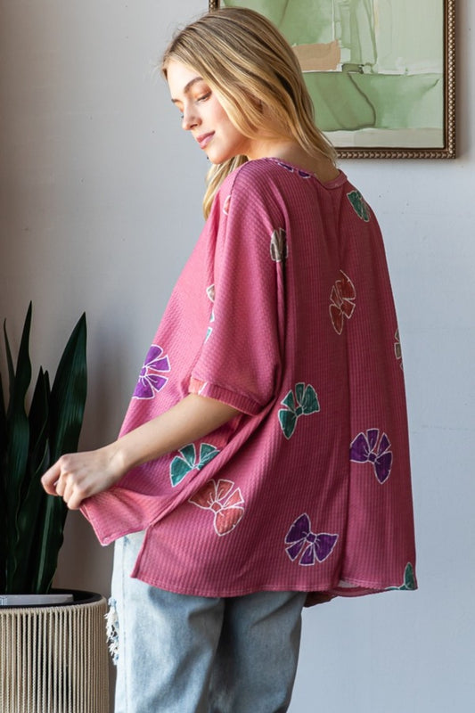 HOPELY Bow Print Waffle Side Slit T-Shirt