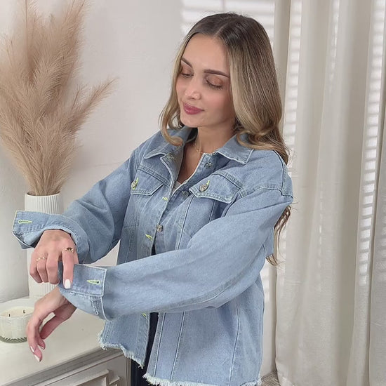 The dropped shoulder raw hem denim jacket is a trendy and edgy wardrobe staple. Its relaxed fit and dropped shoulder design give it a cool and casual vibe, while the raw hem adds a touch of ruggedness. Perfect for layering over any outfit, this jacket adds a stylish and effortless flair to your look.