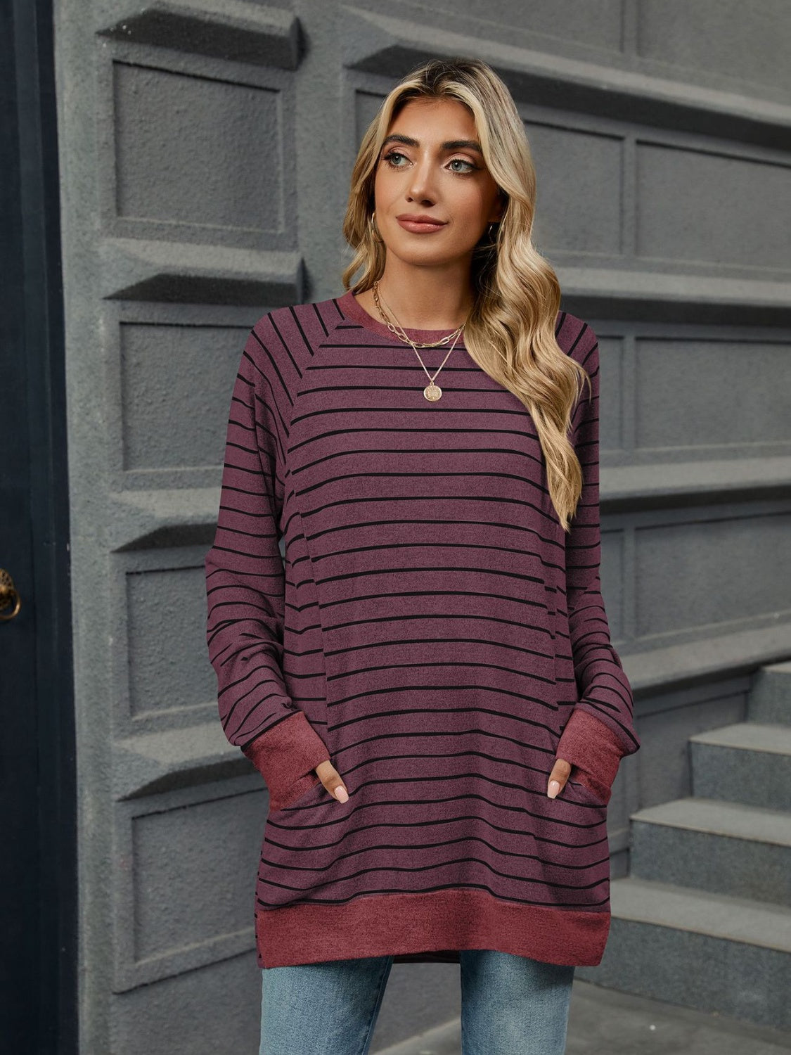 Pocketed Striped Round Neck Long Sleeve T-Shirt