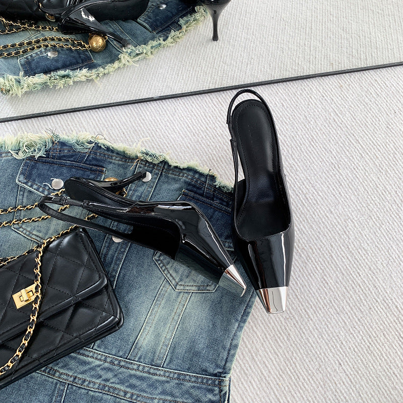 Syncreas Black Square Toe Metal Rear Empty Ankle-strap High Heels